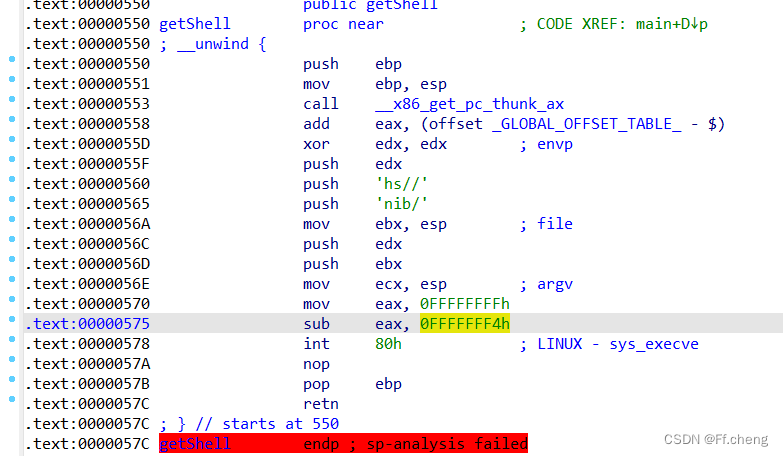 eax = 0FFFFFFFFh - 0FFFFFFF4h = 11。看上面函数也发现result也就是eax的值就是11,也就是调用了execve,还将/bin/sh存入了eax中,所以直接nc 即可