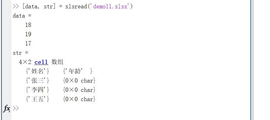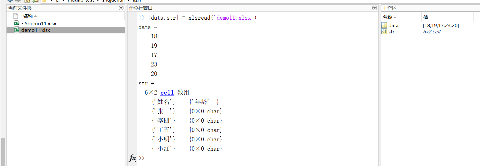 利用,data=xlsread('demo11.xlsx'),就可读取出demo11.xlsx文件夹中的数据。