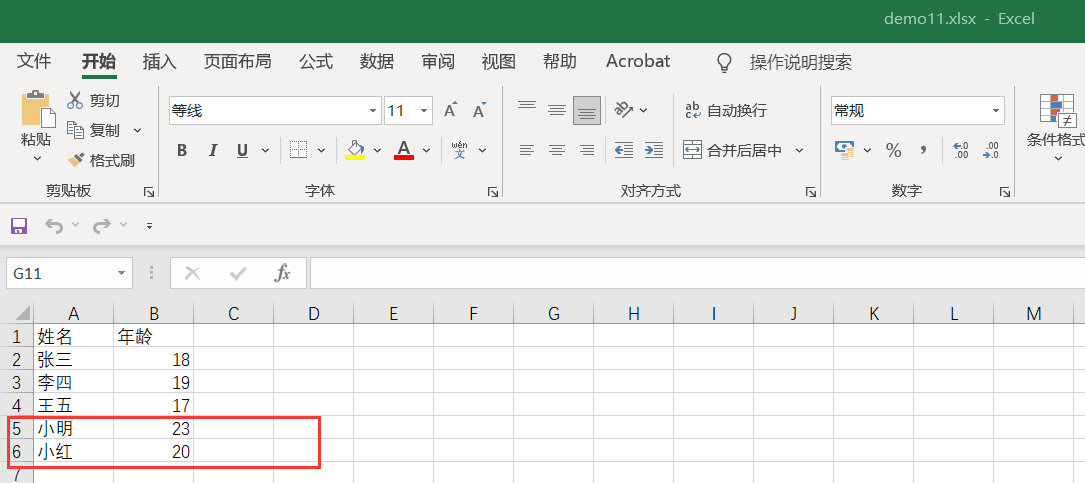 然后,将输入的数据添加到demo11.xlsx中指定的位置处,