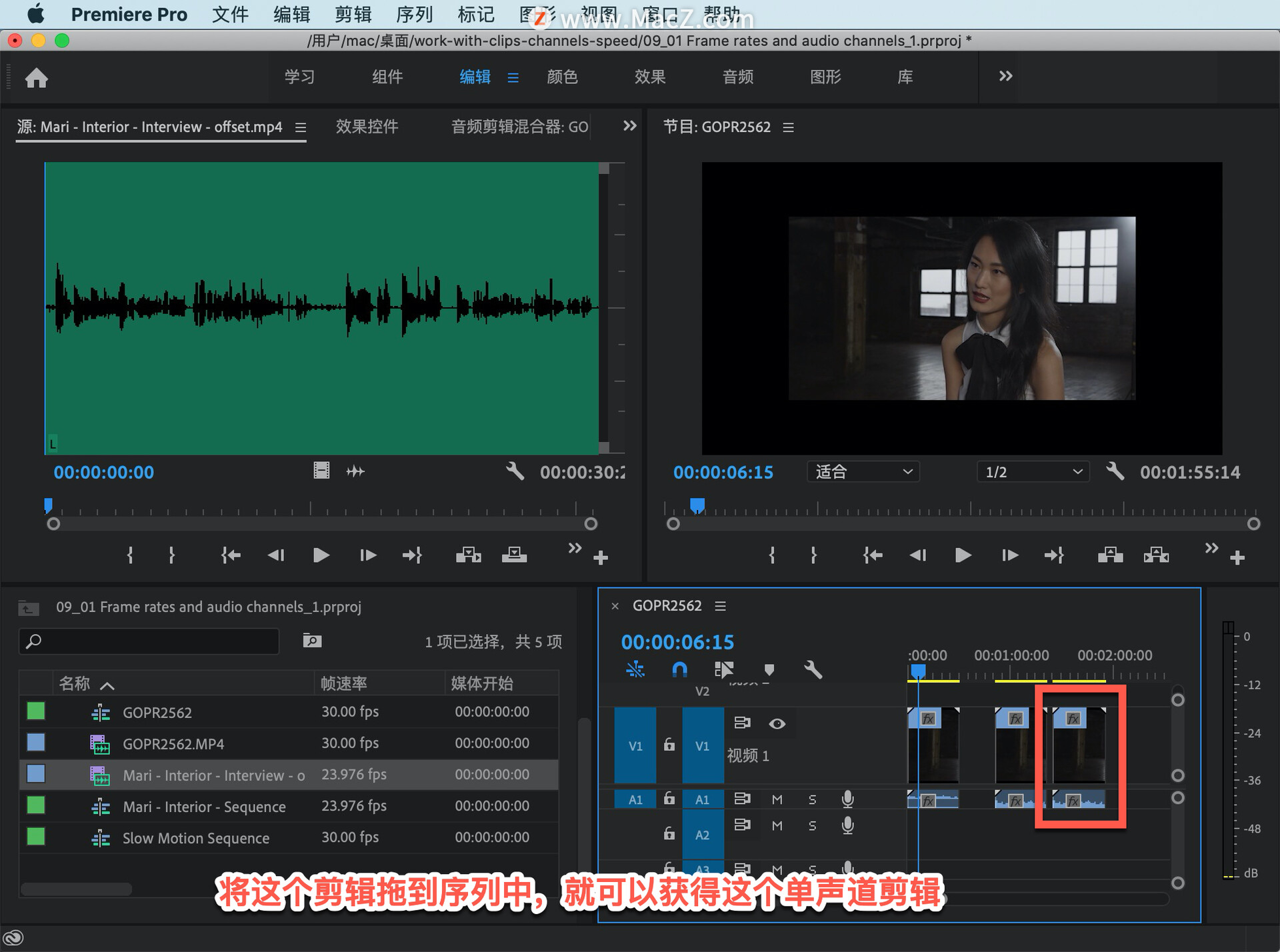 如果将这个剪辑拖到序列中,就可以获得这个单声道剪辑。