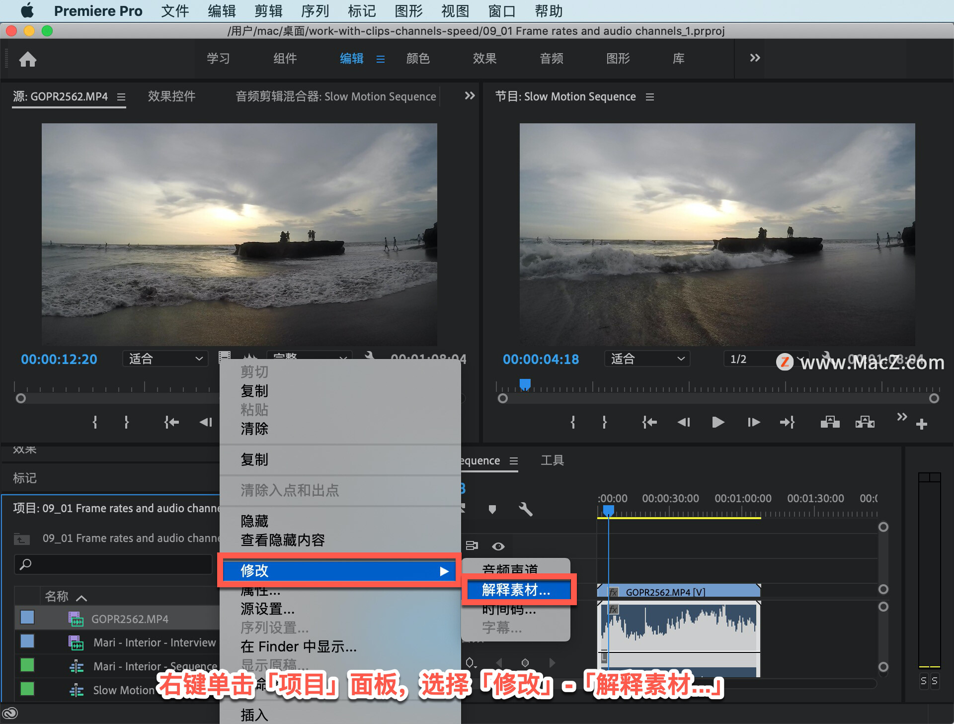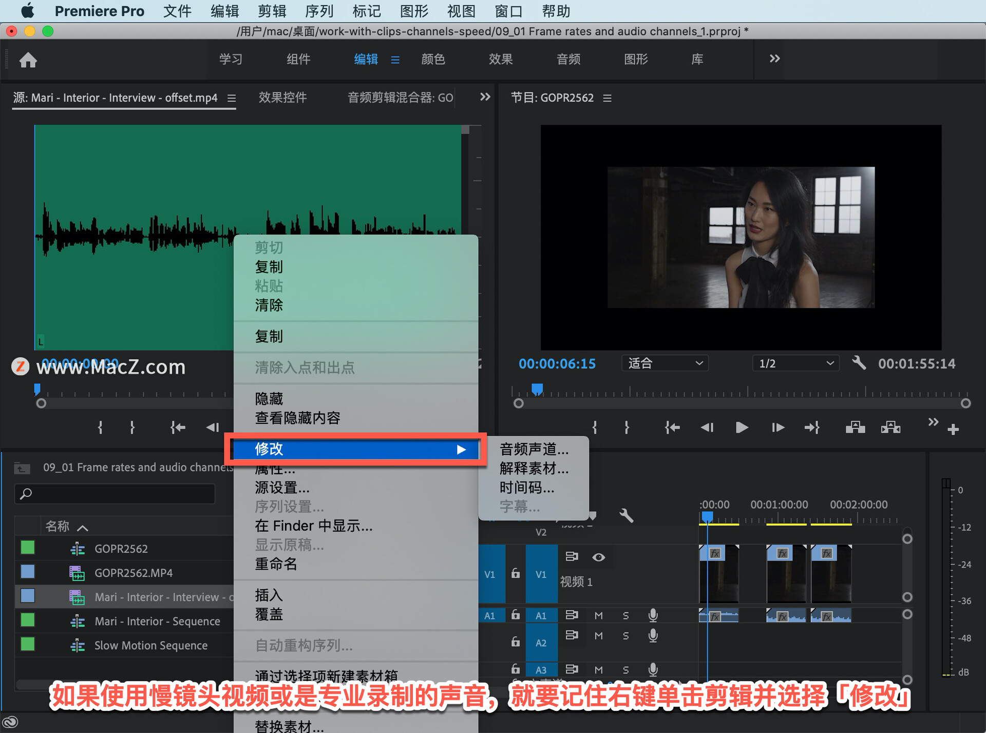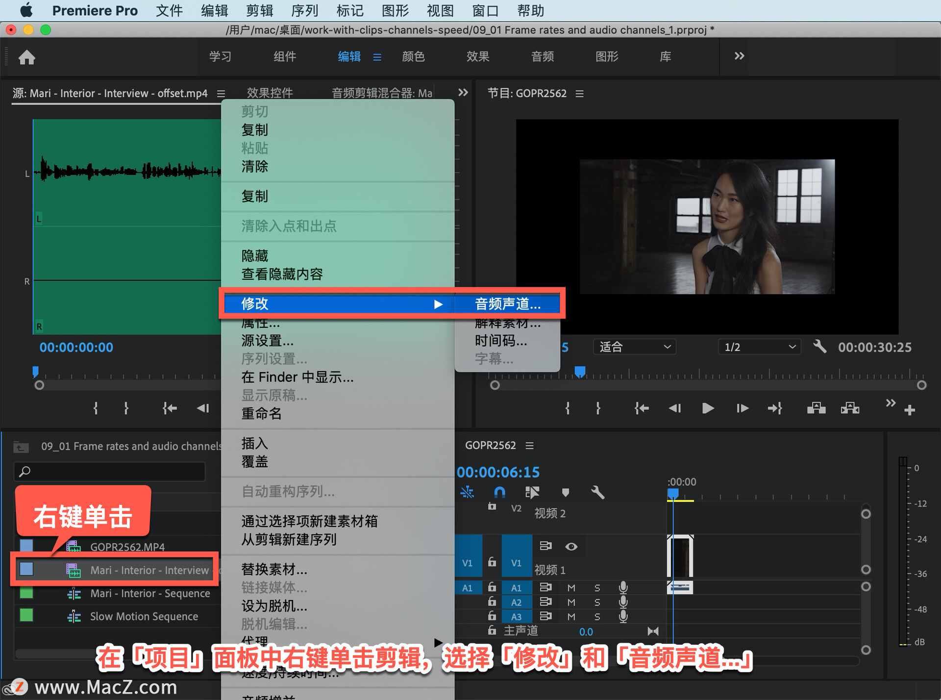 再次在「项目」面板中右键单击剪辑,选择「修改」和「音频声道...」。