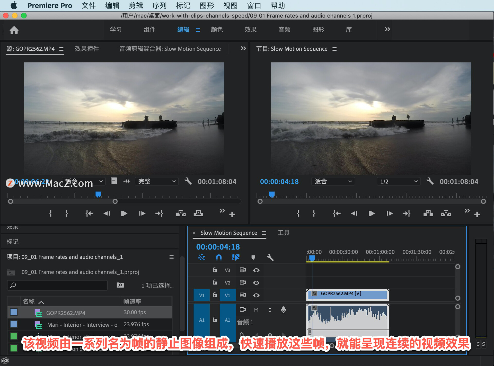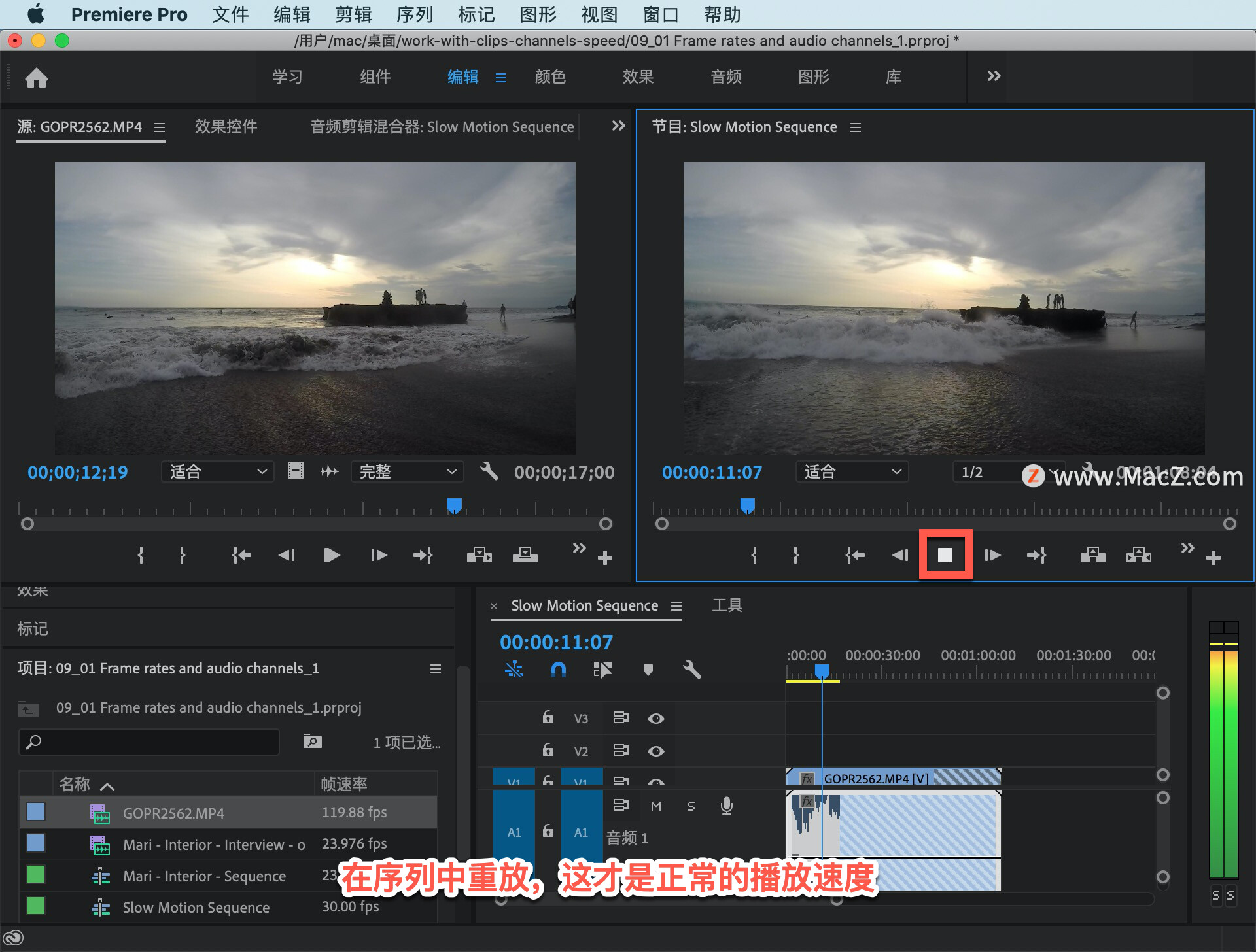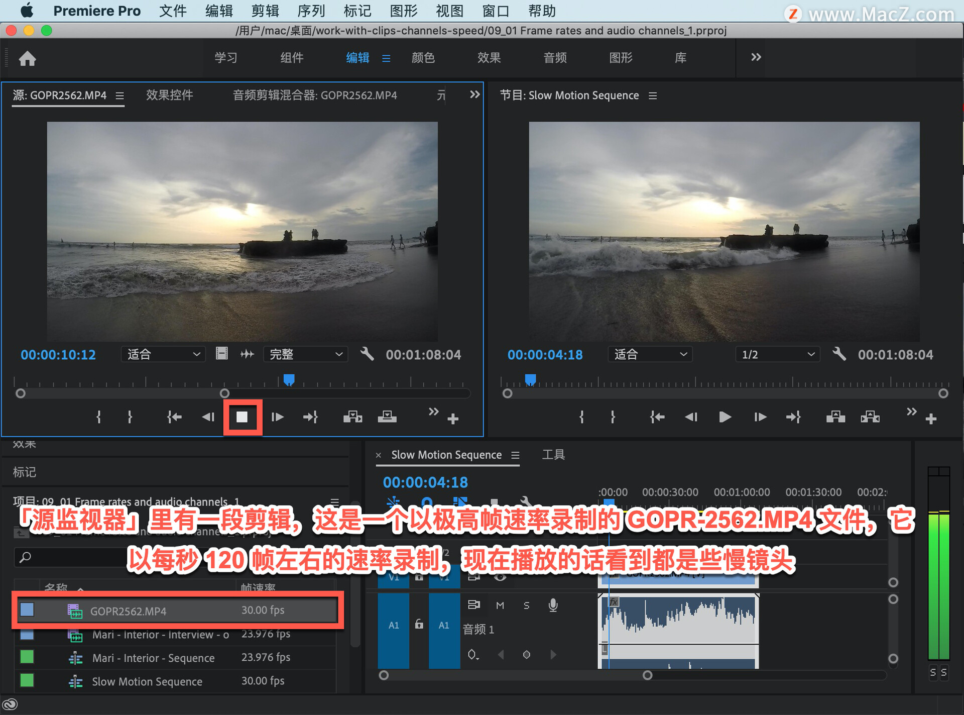 「源监视器」里有一段剪辑,这是一个以极高帧速率录制的 GOPR-2562.MP4 文件,它以每秒 120 帧左右的速率录制,现在播放的话看到都是些慢镜头。其原因在于,虽然录制速率高达每秒 120 帧左右,但播放速率却是每秒 30 帧。