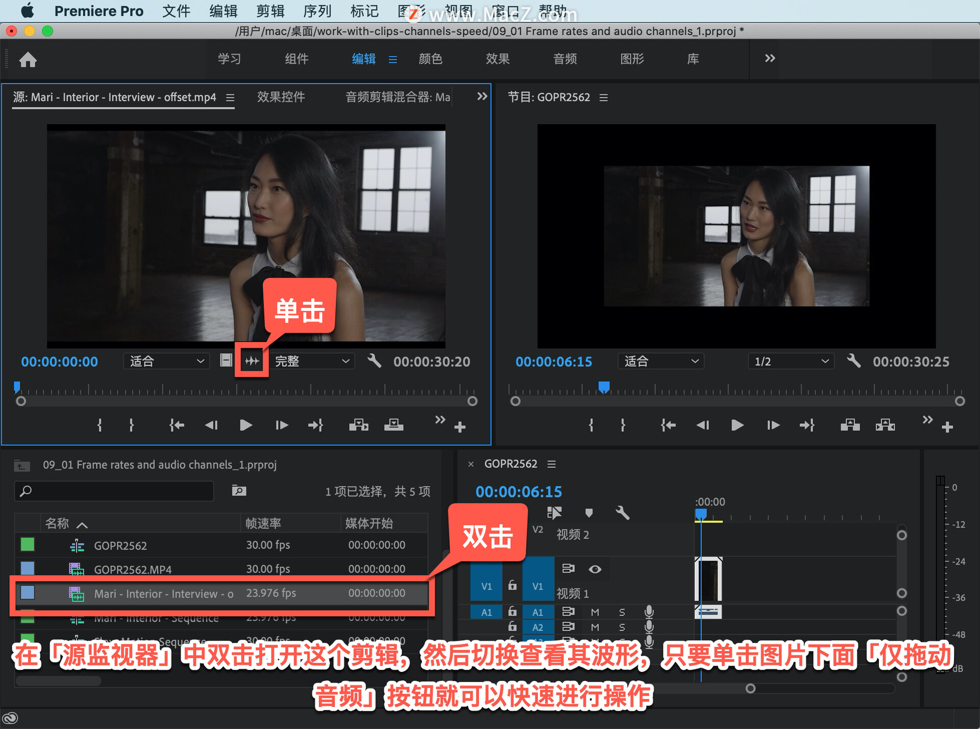 如果我在「源监视器」中双击打开这个剪辑,然后切换查看其波形,只要单击图片下面「仅拖动音频」按钮就可以快速进行操作。