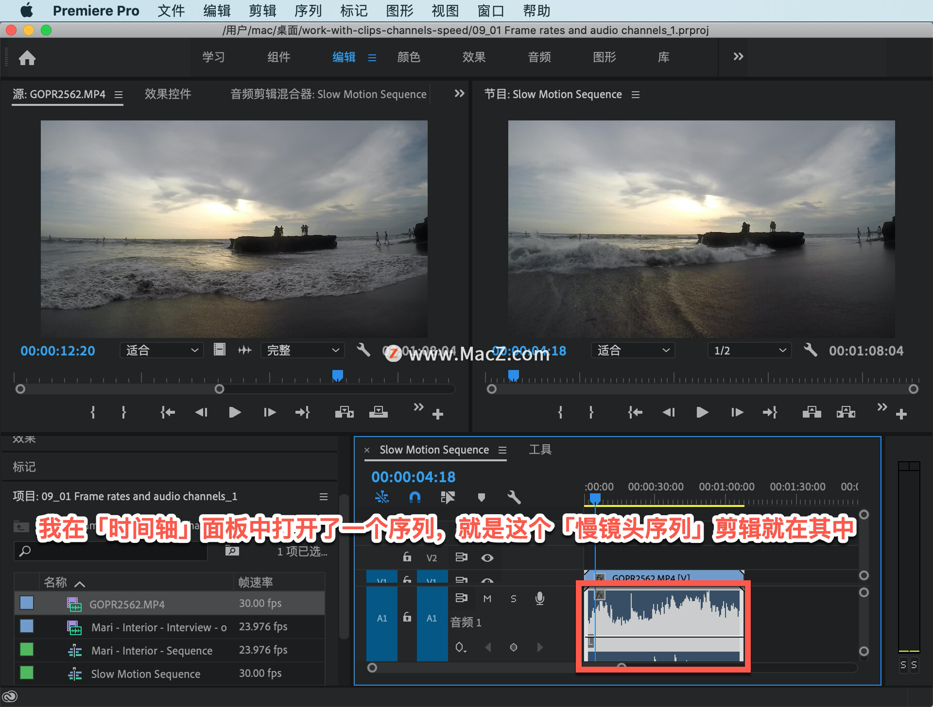 注意,我在「时间轴」面板中打开了一个序列,就是这个「慢镜头序列」剪辑就在其中。