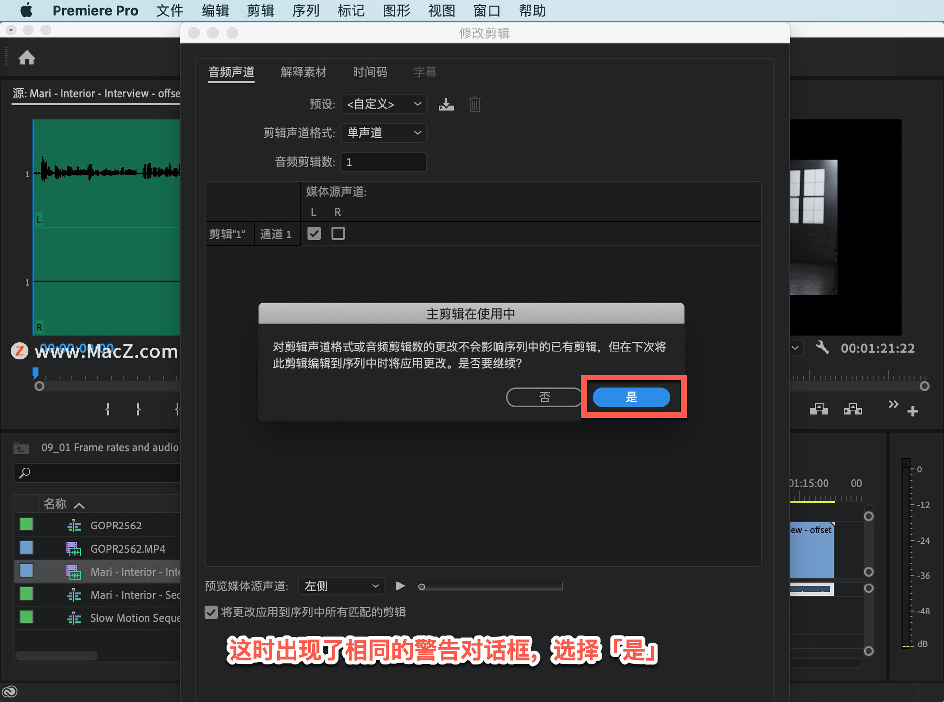 这时出现了警告, 提示所有包含此剪辑的序列都不会有任何变动,选择「是」。
