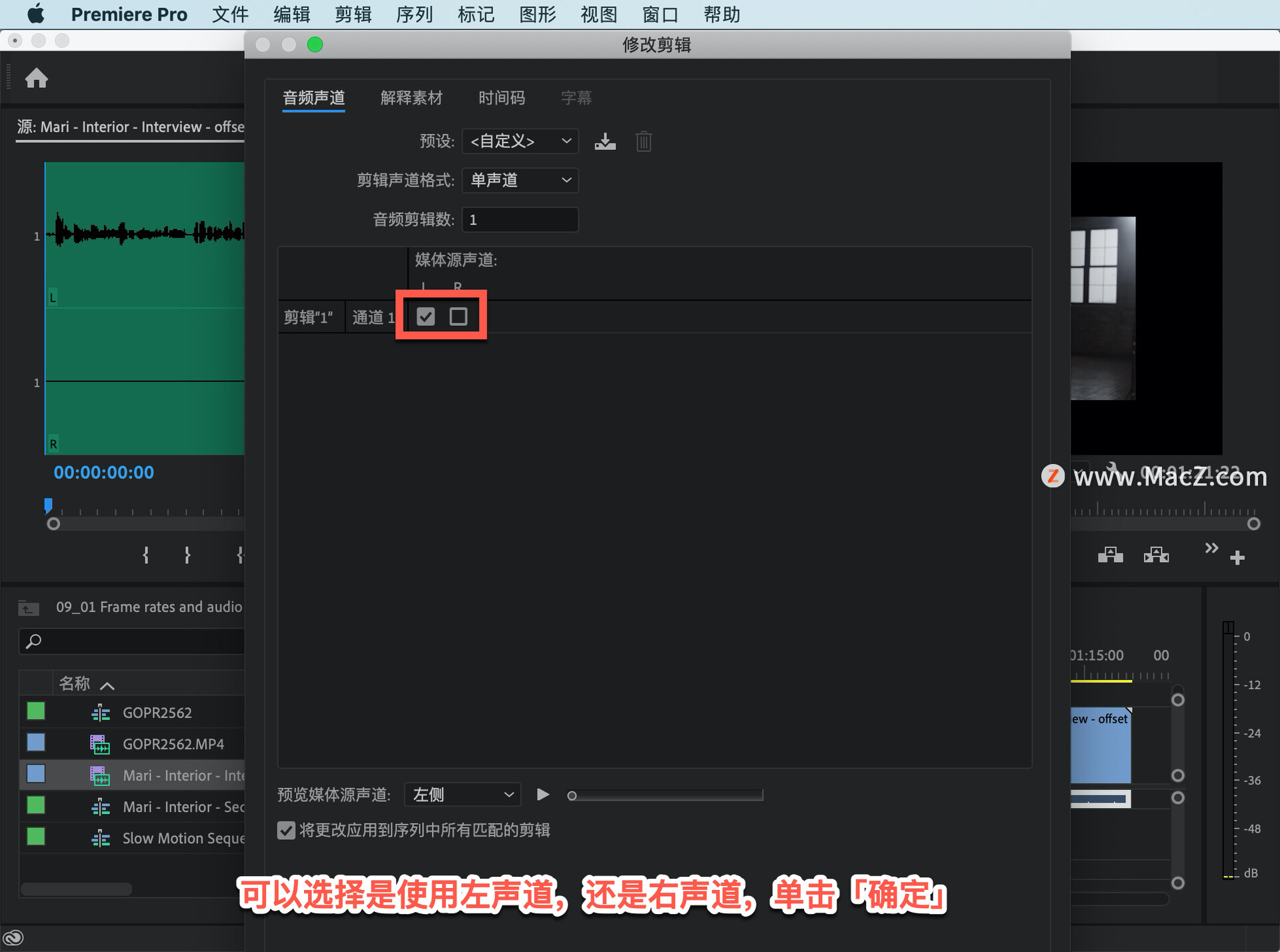 当我在「时间轴」面板中编辑这个视频时,就只有一个音频剪辑会添加到序列中。可以选择是使用左声道,还是右声道,单击「确定」。