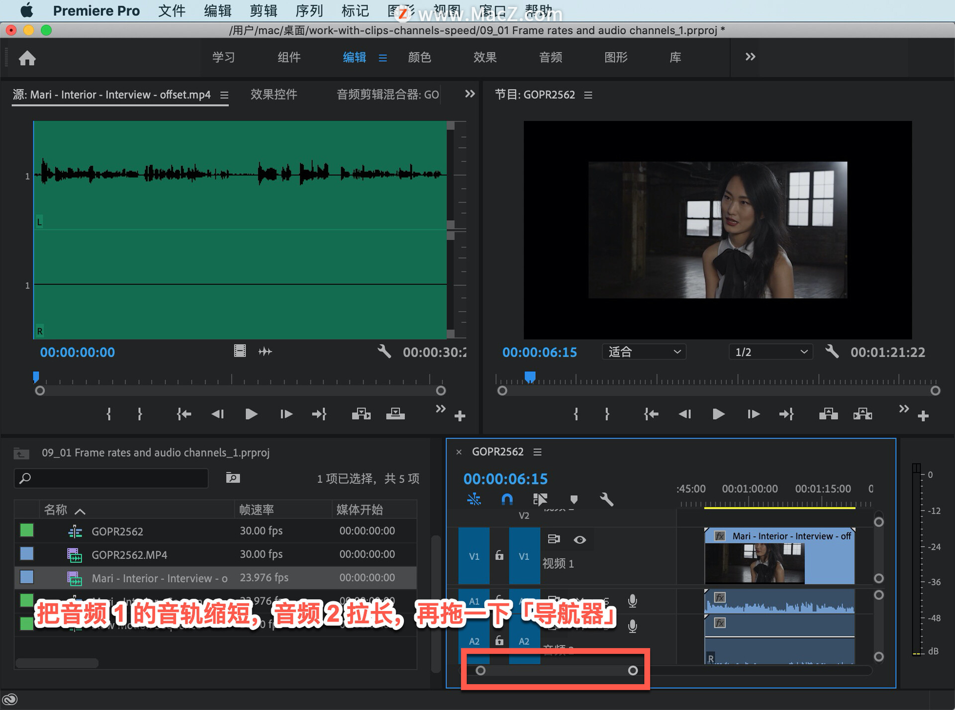 把这个剪辑再次拖到序列中,为了看得清楚把音频 1 的音轨缩短,音频 2 拉长,再拖一下「导航器」。