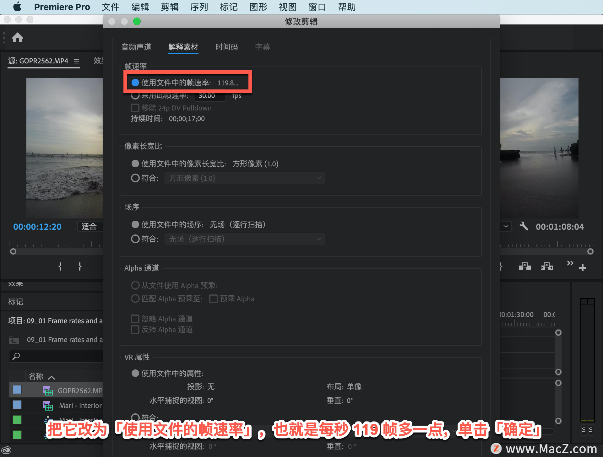 我要把它改为「使用文件的帧速率」,也就是每秒 119 帧多一点,单击「确定」。