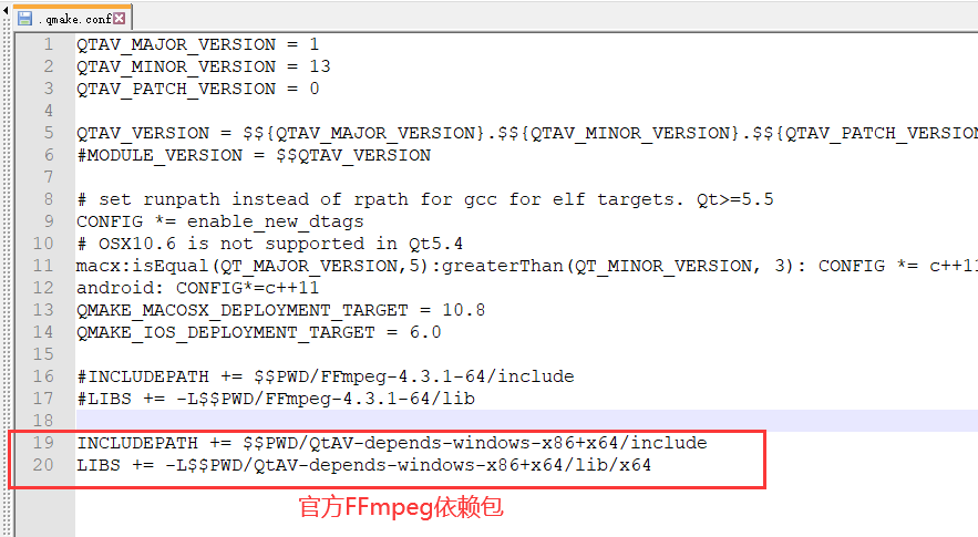 Extract ffmpeg to QtAV source dir. add 2 lines in .qmake.conf