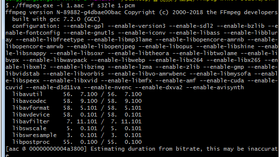 2、从aac文件中分离pcm文件,s32le中的32是每个采样点的占的位数,即4个字节,也可以是s16le即2个字节: