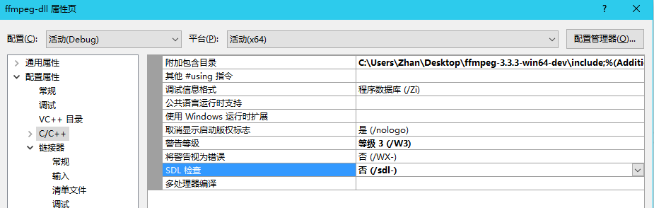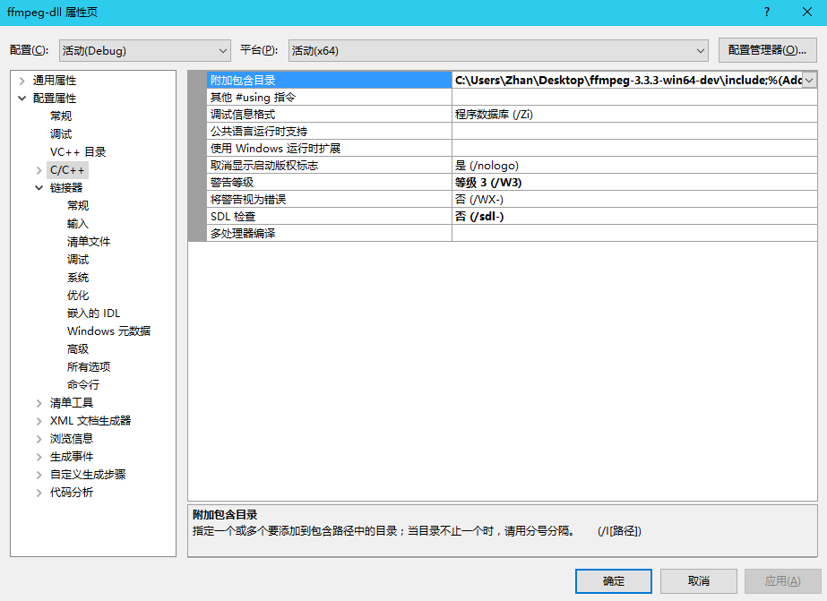 include路径:C:UsersZhanDesktopffmpeg-3.3.3-win64-devinclude