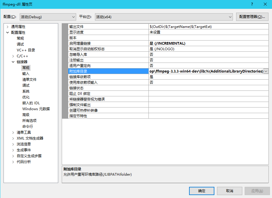 lib路径:C:UsersZhanDesktopffmpeg-3.3.3-win64-devlib