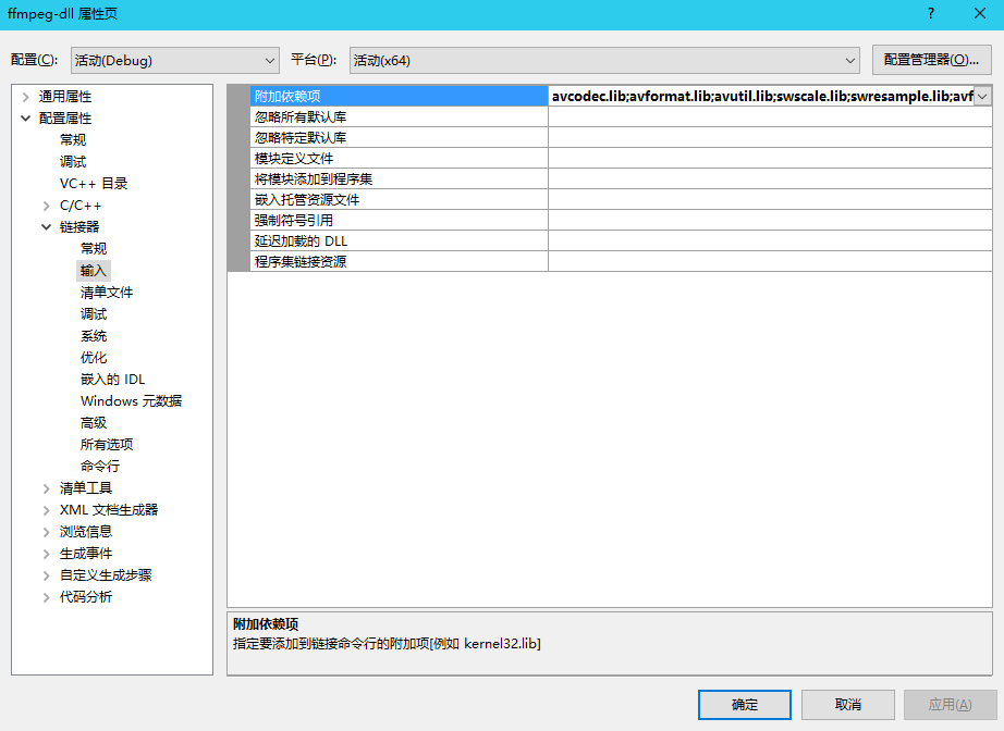 在附加依赖性添加avcodec.lib;avformat.lib;avutil.lib;swscale.lib;swresample.lib;avfilter.lib;swscale.lib (需要用到库文件对应添加)