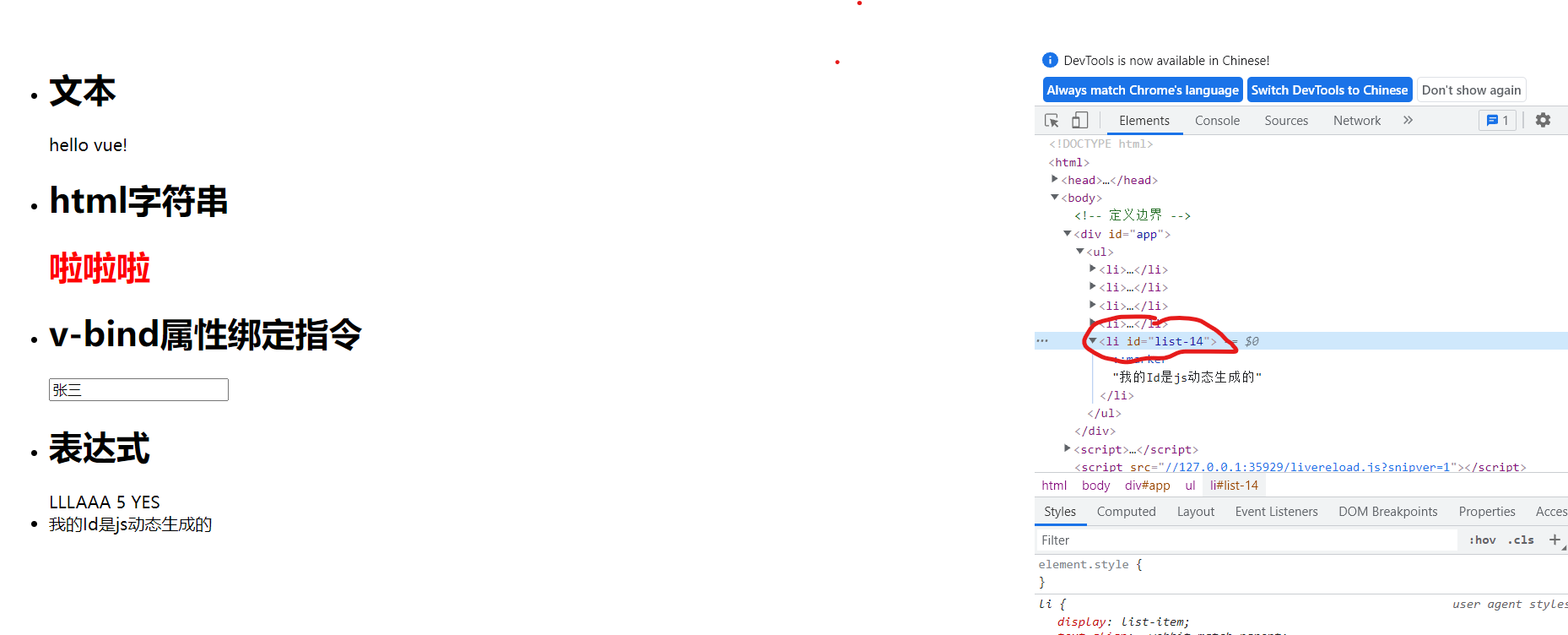 <li v-bind:id="'list-' + id">我的Id是js动态生成的</li>
