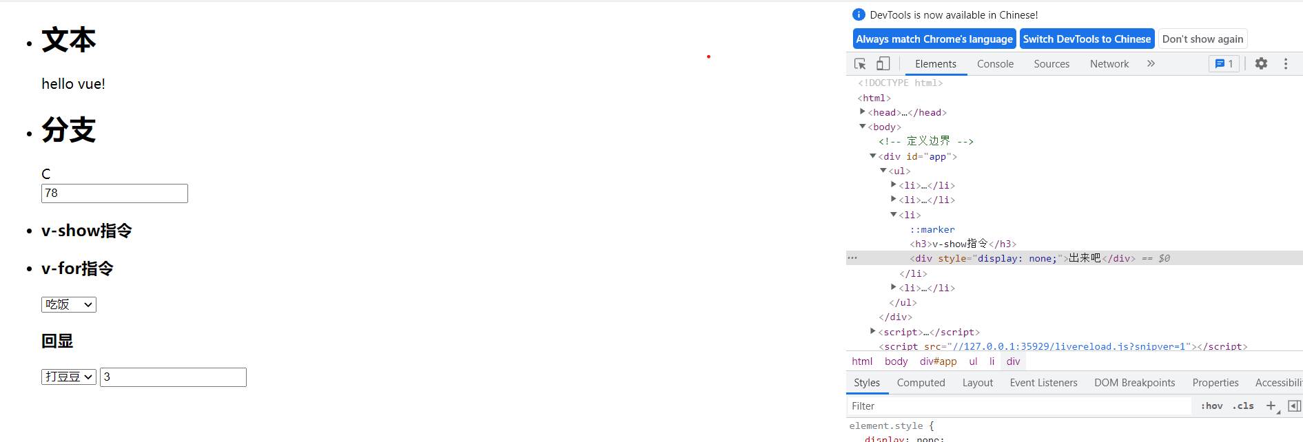 v-show false:将元素隐藏,但是控制台会显示(display:none)