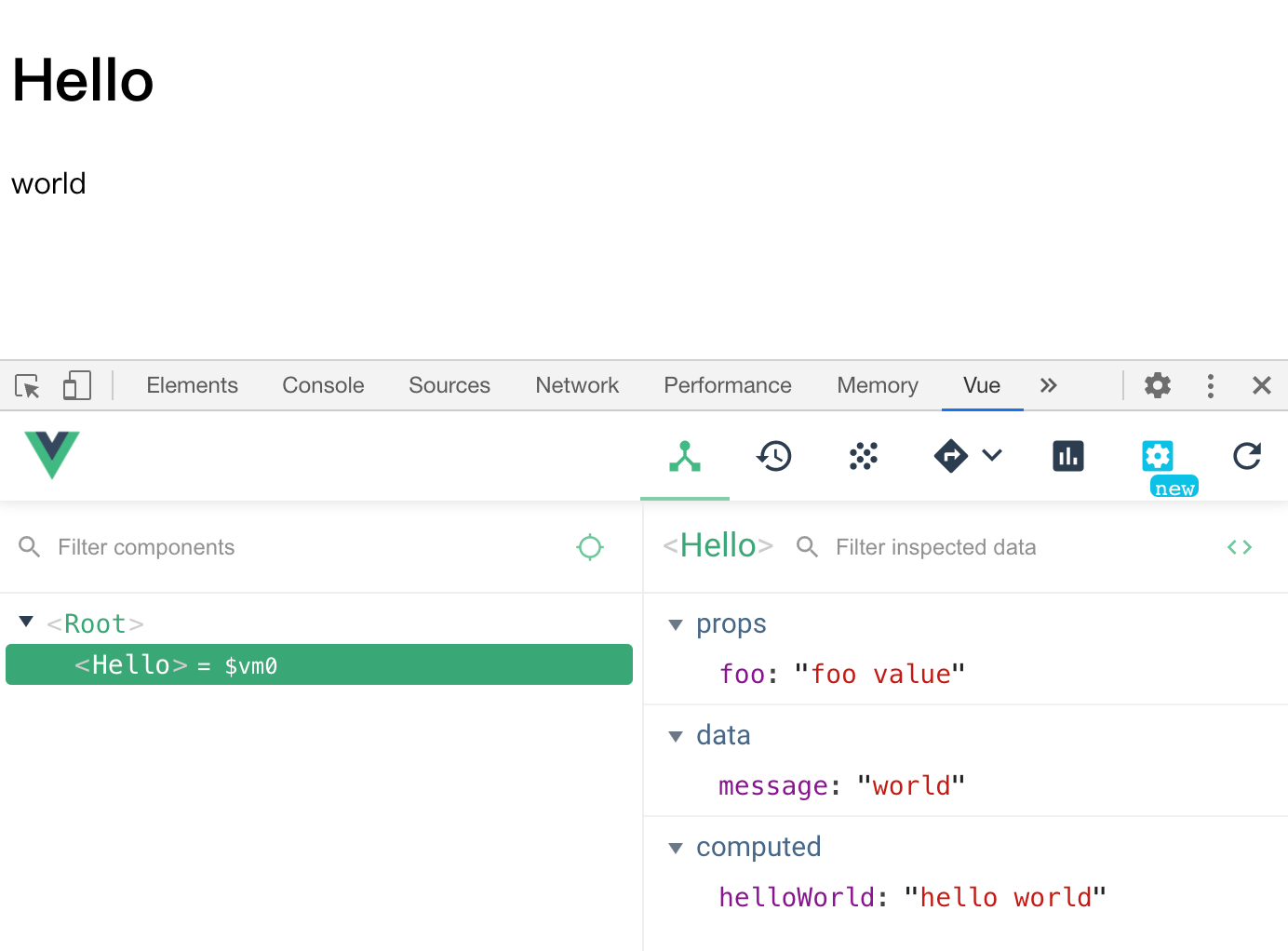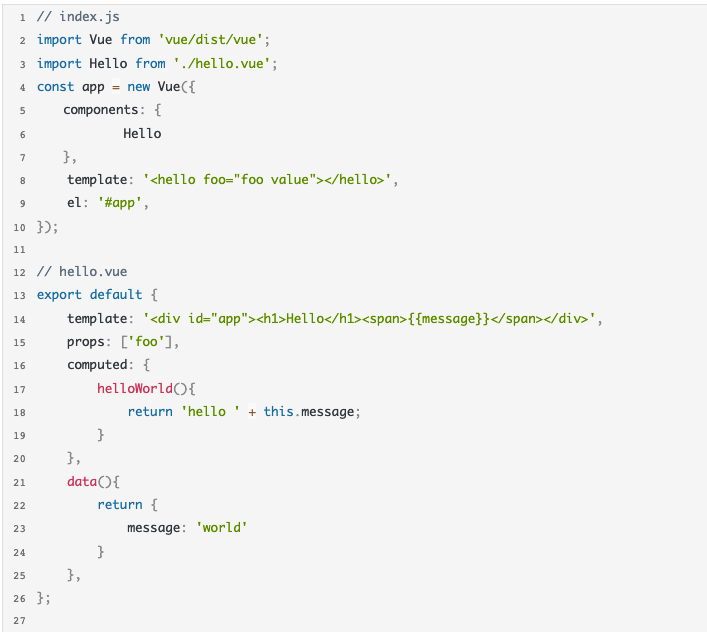 在这个例子中我们定义了一个组件 Hello,然后将它从 app 根组件中进行挂载,最后将 app 挂载到#app 上。