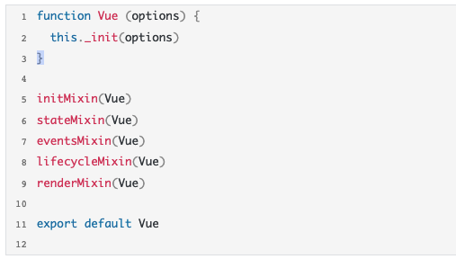这段代码比较简单,它定义了一个 Vue 构造函数,构造函数中唯一的一行代码是调用了实例的_init() 方法。在这段代码的最后,Vue 构建函数作为整个模块唯一的成员被导出。