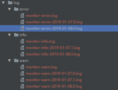 <?xml version="1.0" encoding="UTF-8"?> <configuration> <!-- 按照每天生成日志文件 --> <appender name="FILEINFO" class="ch.qos.logback.core.rolling.RollingFileAppender"> <!--正在记录的日志--> <file>log/info/monitor-info.log</file> <rollingPolicy class="ch.qos.logback.core.rolling.TimeBasedRollingPolicy"> <!--日志文件输出的文件名--> <FileNamePattern>log/info/monitor-info-%d{yyyy-MM-dd}.%i.log</FileNamePattern> <!--日志文件保留天数--> <MaxHistory>30</MaxHistory> <timeBasedFileNamingAndTriggeringPolicy class="ch.qos.logback.core.rolling.SizeAndTimeBasedFNATP"> <maxFileSize>2MB</maxFileSize> </timeBasedFileNamingAndTriggeringPolicy> </rollingPolicy> <!-- 追加方式记录日志 --> <append>true</append> <encoder class="ch.qos.logback.classic.encoder.PatternLayoutEncoder"> <!--格式化输出:%d表示日期,%thread表示线程名,%-5level:级别从左显示5个字符宽度%msg:日志消息,%n是换行符--> <pattern>%d{yyyy-MM-dd HH:mm:ss.SSS} %-5level %logger Line:%-3L - %msg%n</pattern> <charset>utf-8</charset> </encoder> <filter class="ch.qos.logback.classic.filter.LevelFilter"> <level>INFO</level> <onMatch>ACCEPT</onMatch> <onMismatch>DENY</onMismatch> </filter> </appender> <appender name="FILEWARN" class="ch.qos.logback.core.rolling.RollingFileAppender"> <!--正在记录的日志--> <file>log/warn/monitor-warn.log</file> <rollingPolicy class="ch.qos.logback.core.rolling.TimeBasedRollingPolicy"> <!--日志文件输出的文件名--> <FileNamePattern>log/warn/monitor-warn-%d{yyyy-MM-dd}.%i.log</FileNamePattern> <!--日志文件保留天数--> <MaxHistory>30</MaxHistory> <timeBasedFileNamingAndTriggeringPolicy class="ch.qos.logback.core.rolling.SizeAndTimeBasedFNATP"> <maxFileSize>2MB</maxFileSize> </timeBasedFileNamingAndTriggeringPolicy> </rollingPolicy> <!-- 追加方式记录日志 --> <append>true</append> <encoder class="ch.qos.logback.classic.encoder.PatternLayoutEncoder"> <!--格式化输出:%d表示日期,%thread表示线程名,%-5level:级别从左显示5个字符宽度%msg:日志消息,%n是换行符--> <pattern>%d{yyyy-MM-dd HH:mm:ss.SSS} %-5level %logger Line:%-3L - %msg%n</pattern> <charset>utf-8</charset> </encoder> <filter class="ch.qos.logback.classic.filter.LevelFilter"> <level>WARN</level> <onMatch>ACCEPT</onMatch> <onMismatch>DENY</onMismatch> </filter> </appender> <appender name="FILEERROR" class="ch.qos.logback.core.rolling.RollingFileAppender"> <!--正在记录的日志--> <file>log/error/monitor-error.log</file> <rollingPolicy class="ch.qos.logback.core.rolling.TimeBasedRollingPolicy"> <!--日志文件输出的文件名--> <FileNamePattern>log/error/monitor-error-%d{yyyy-MM-dd}.%i.log</FileNamePattern> <!--日志文件保留天数--> <MaxHistory>30</MaxHistory> <timeBasedFileNamingAndTriggeringPolicy class="ch.qos.logback.core.rolling.SizeAndTimeBasedFNATP"> <maxFileSize>2MB</maxFileSize> </timeBasedFileNamingAndTriggeringPolicy> </rollingPolicy> <!-- 追加方式记录日志 --> <append>true</append> <encoder class="ch.qos.logback.classic.encoder.PatternLayoutEncoder"> <!--格式化输出:%d表示日期,%thread表示线程名,%-5level:级别从左显示5个字符宽度%msg:日志消息,%n是换行符--> <pattern>%d{yyyy-MM-dd HH:mm:ss.SSS} %-5level %logger Line:%-3L - %msg%n</pattern> <charset>utf-8</charset> </encoder> <filter class="ch.qos.logback.classic.filter.LevelFilter"> <level>ERROR</level> <onMatch>ACCEPT</onMatch> <onMismatch>DENY</onMismatch> </filter> </appender> <!-- 彩色日志 --> <!-- 彩色日志依赖的渲染类 --> <conversionRule conversionWord="clr" converterClass="org.springframework.boot.logging.logback.ColorConverter" /> <conversionRule conversionWord="wEx" converterClass="org.springframework.boot.logging.logback.ExtendedWhitespaceThrowableProxyConverter" /> <!-- 彩色日志格式 --> <property name="CONSOLE_LOG_PATTERN" value="${CONSOLE_LOG_PATTERN:-%clr(%d{yyyy-MM-dd HH:mm:ss.SSS}){faint} %clr(${LOG_LEVEL_PATTERN:-%5p}) %clr(${PID:- }){magenta} %clr(---){faint} %clr([%15.15t]){faint} %clr(%-40.40logger{39}){cyan} %clr(:){faint} %m%n${LOG_EXCEPTION_CONVERSION_WORD:-%wEx}}" /> <appender name="STDOUT" class="ch.qos.logback.core.ConsoleAppender"> <!--encoder 默认配置为PatternLayoutEncoder--> <encoder> <pattern>${CONSOLE_LOG_PATTERN}</pattern> <charset>utf-8</charset> </encoder> <!--此日志appender是为开发使用,只配置最底级别,控制台输出的日志级别是大于或等于此级别的日志信息--> <filter class="ch.qos.logback.classic.filter.ThresholdFilter"> <level>INFO</level> </filter> </appender> <!-- 日志输出级别 --> <root level="INFO"> <appender-ref ref="FILEINFO"/> <appender-ref ref="FILEWARN"/> <appender-ref ref="FILEERROR"/> <appender-ref ref="STDOUT"/> </root> </configuration>