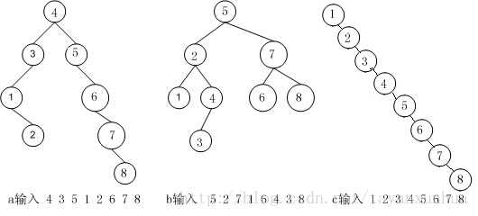 很显然,二叉查找树查找一个数据,不需要遍历全部的节点,查找效率确实提高了。但是,也有一个很严重的问题,我在a图中查找8需要比较5次,而在b图中查找8需要3次,更为严重的是,我的二叉查找树是c图,如果再查找8,那将会如何呢?很显然,整棵树就退化成了一个线性结构,此时再查找8,就和顺序查找没什么区别了。