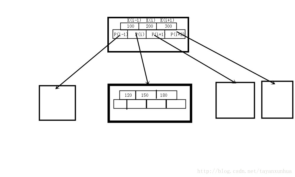 关于b所述的内容,一直没有理解明白,后来还是通过这张图才理解,此图中我省略了一些节点,仅仅画出了Pi指向的那个节点,这个节点中的关键字全部都是大于K(i-1),并且小于Ki 的。(注意:P 的个数 比 K 的个数多 1 个)