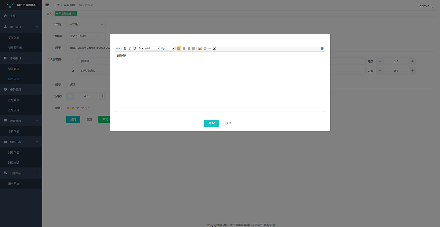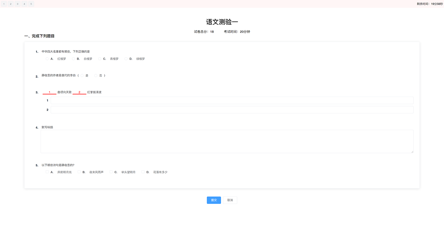 | 题目创建 | 题目支持单选题、多选题、判断题、填空题、简答题,题干支持文本、图片、表格、数学公式 |