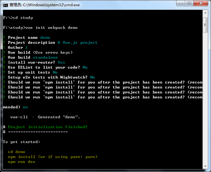 vue init webpack demo //demo是你的项目目录