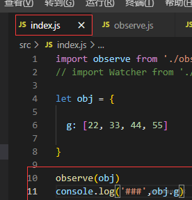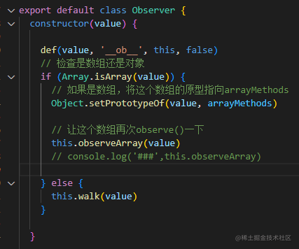 // 遍历walk(value) {for (let k in value) {defineReactive(value, k);}}// 数组的特殊遍历observeArray(arr) {for (let i = 0, l = arr.length; i < l; i++) {// 逐项进行observeobserve(arr[i]);}}