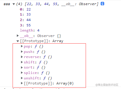 此时就能看到这个数组的原型已经被覆盖,因为上面提到过Object . setPrototypeOf (value , arrayMethods),这个方法用来改变对象的原型,value就是传进来的数组obj,指向引进来的arrayMethods对象