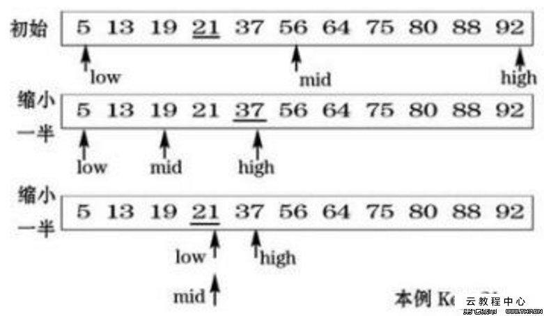 快速查找也称二分查找,二分查找的基本思想是将n个元素分成大致相等的两部分,取a[n/2]与x做比较,如果x=a[n/2],则找到x,算法中止;如果x<a[n/2],则只要在数组a的左半部分继续搜索x,如果x>a[n/2],则只要在数组a的右半部搜索x.