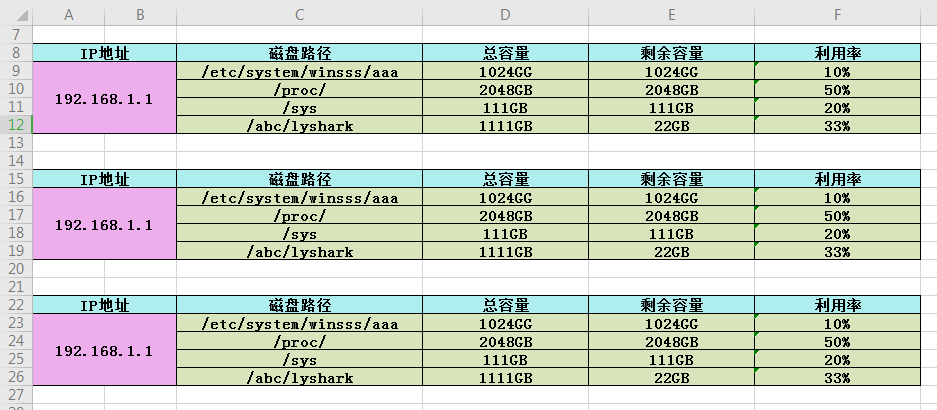 ["IP地址", "IP地址", "磁盘路径", "总容量", "剩余容量", "利用率"],
