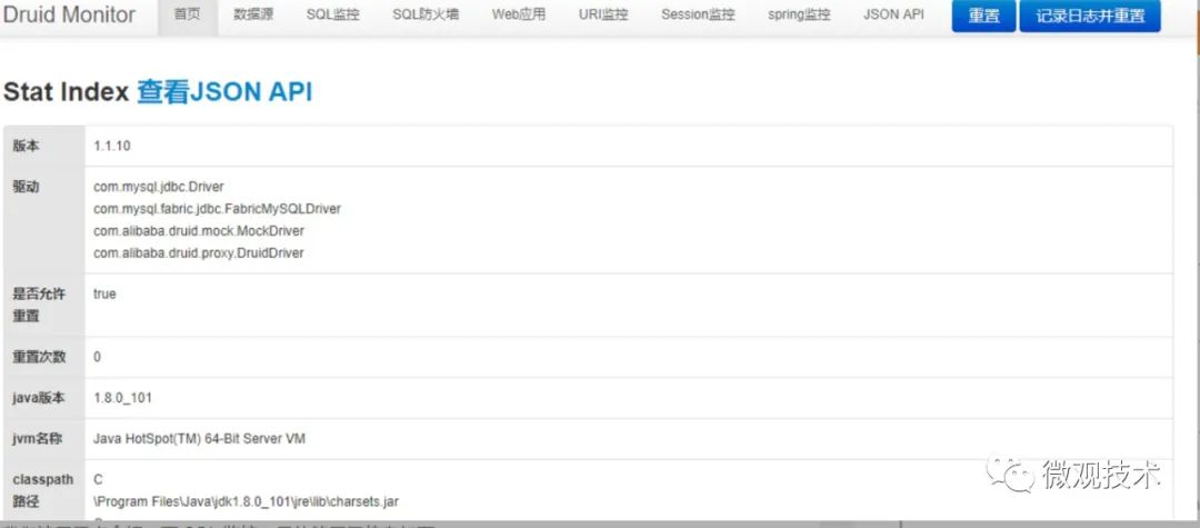 首页会展示项目使用的 JDK 版本、数据库驱动、JVM 相关统计信息。根据上面的菜单可以看出 Druid 的功能非常强大,支持数据源、SQL 监控、SQL 防火墙、URI 监控等很多功能。