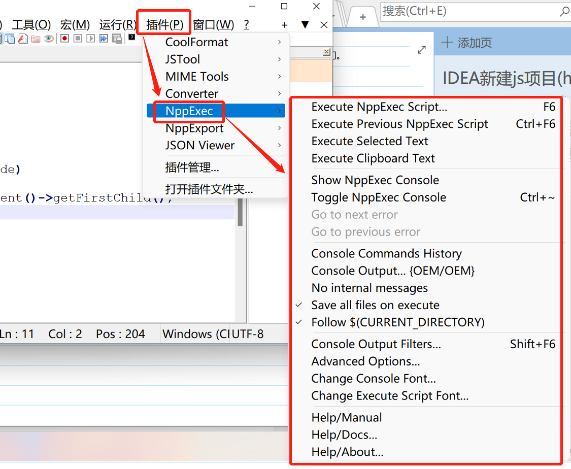 4.安装成功后,可能需要重启npp。重启后,npp的Plugins菜单里会多一个NppExec子菜单。