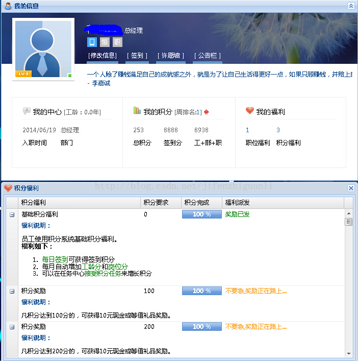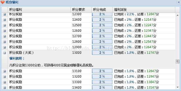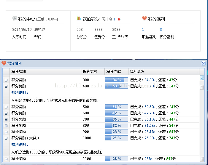 这是员工自己的界面,积分奖励界面,不是定时发放,而是根据你积分到达实时发放。图中有自己积分还有达到最终大奖的完成度,可以一目了然的看清楚。下图: