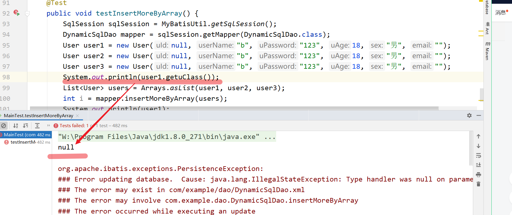 at com.exmple.test.MainTest.testInsertMoreByArray(MainTest.java:100)
