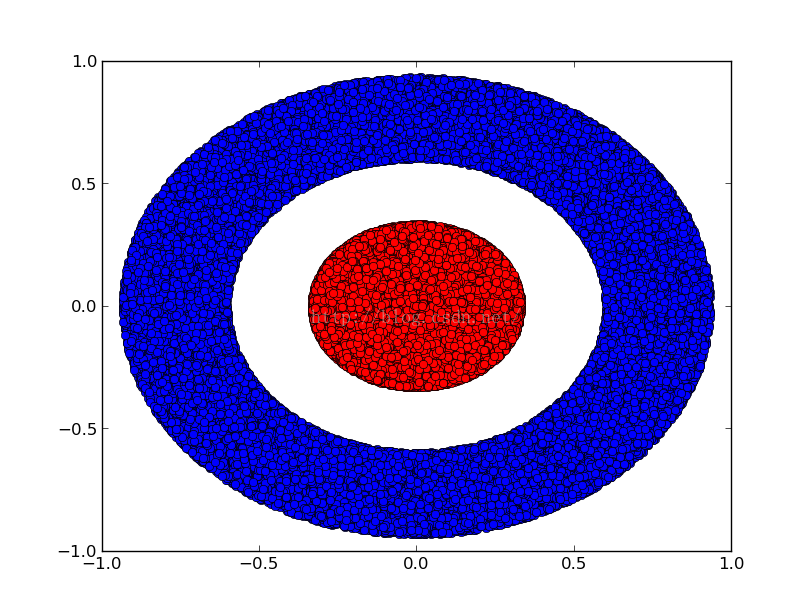 像之前的数据集一样,但这个数据集无法用n+1维的变换使其变得线性可分。