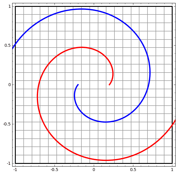 另一方面,下面的螺旋线缠绕的更复杂一些,神经网络已经不能将其成功分类了。