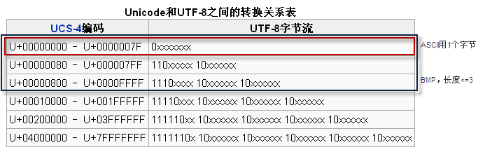 | U+00000000 – U+0000007F | 0xxxxxxx |