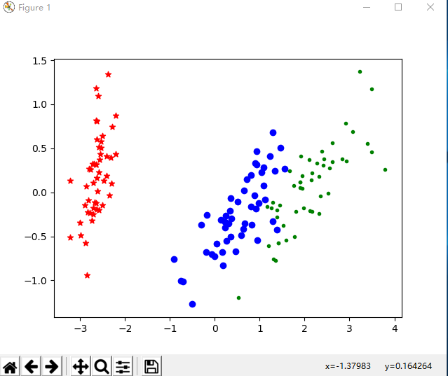 #实例:鸢尾花数据降维可视化 import matplotlib.pyplot as plt from sklearn.decomposition import PCA from sklearn.datasets import load_iris data=load_iris() y=data.target #数据集中的标签 x=data.data #数据集中的属性数据 pca=PCA(n_components=2) #降维后主成分数目 reduced_x=pca.fit_transform(x) #降维 red_x,red_y=[],[] blue_x,blue_y=[],[] green_x,green_y=[],[] #用于存储类别数据 for i in range(len(reduced_x)): if y[i]==0: red_x.append(reduced_x[i][0]) red_y.append(reduced_x[i][1]) elif y[i]==1: blue_x.append(reduced_x[i][0]) blue_y.append(reduced_x[i][1]) else: green_x.append(reduced_x[i][0]) green_y.append(reduced_x[i][1]) plt.scatter(red_x,red_y,c='r',marker='*') plt.scatter(blue_x,blue_y,c='b',marker='o') plt.scatter(green_x,green_y,c='g',marker='.') plt.show()