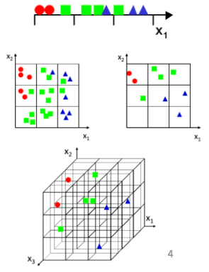 维数灾难就是说当样本的维数增加时,若要保持与低维情形下相同的样本密度,所需要的样本数指数型增长。从下面的图可以直观体会一下。当维度很大样本数量少时,无法通过它们学习到有价值的知识;所以需要降维,一方面在损失的信息量可以接受的情况下获得数据的低维表示,增加样本的密度;另一方面也可以达到去噪的目的。