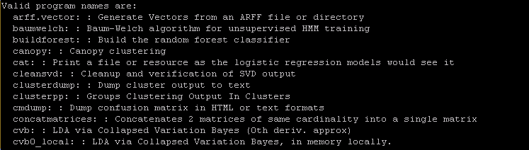 安装成功后,此命令将显示mahout实现的所有算法命令,如下图所示。