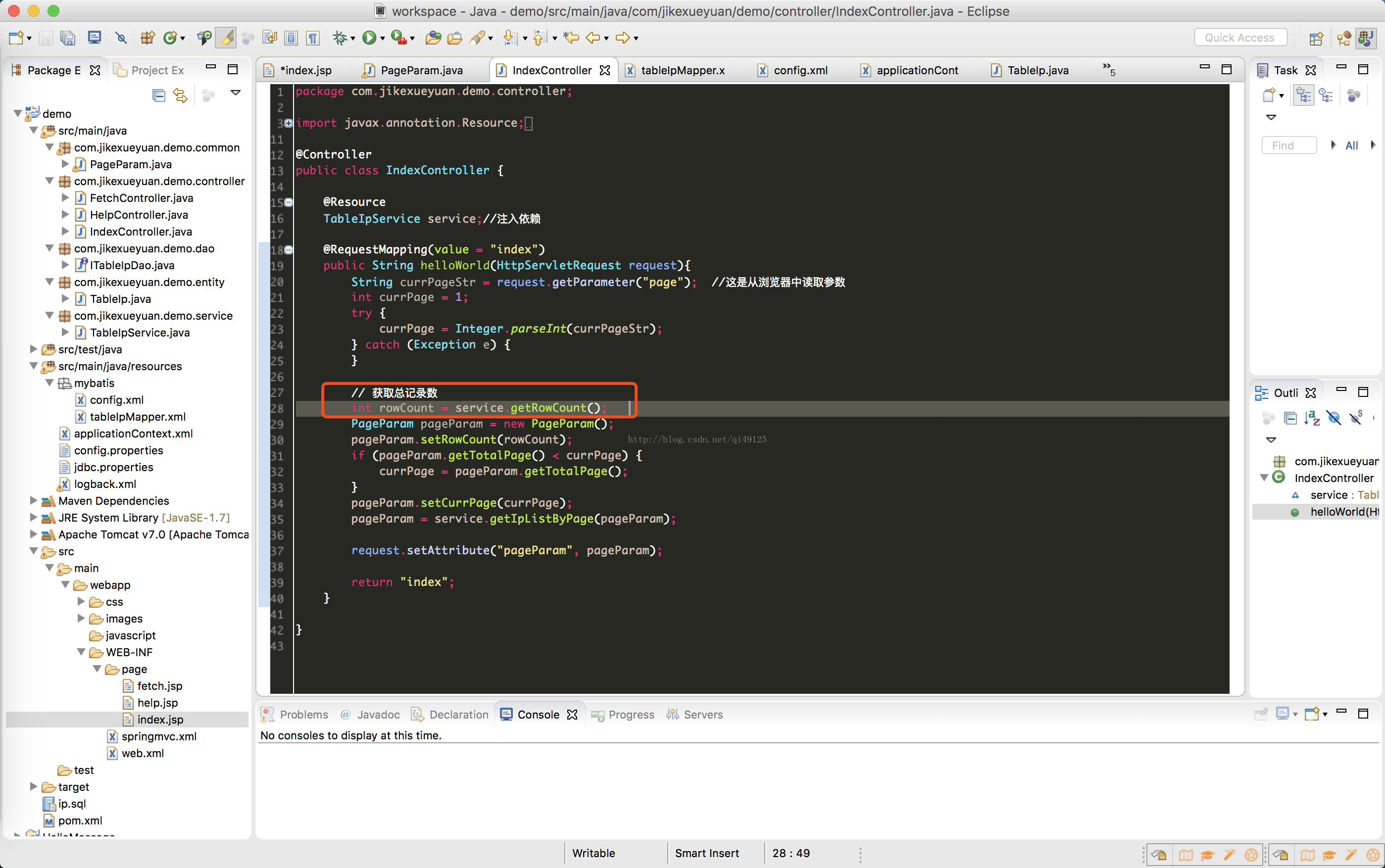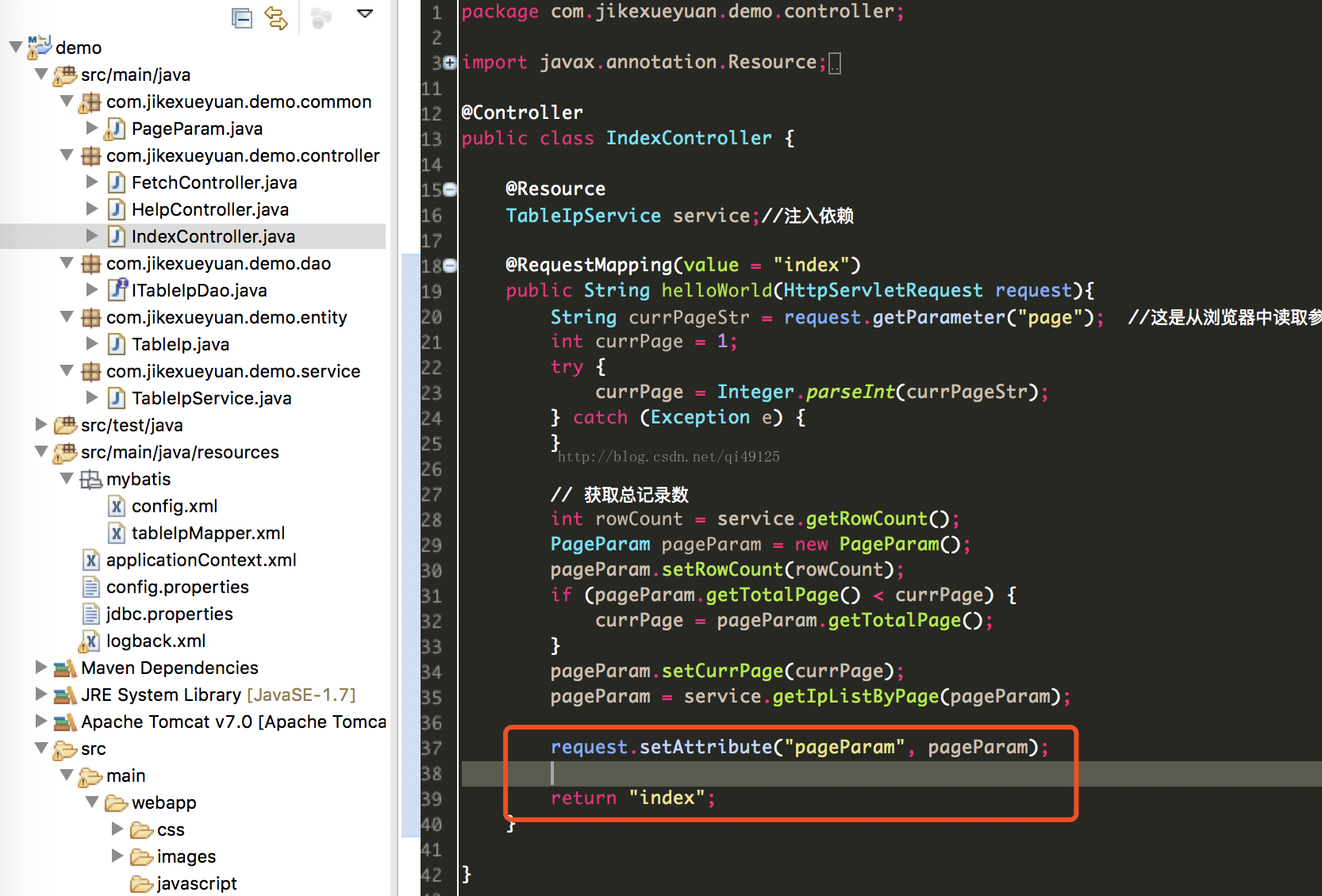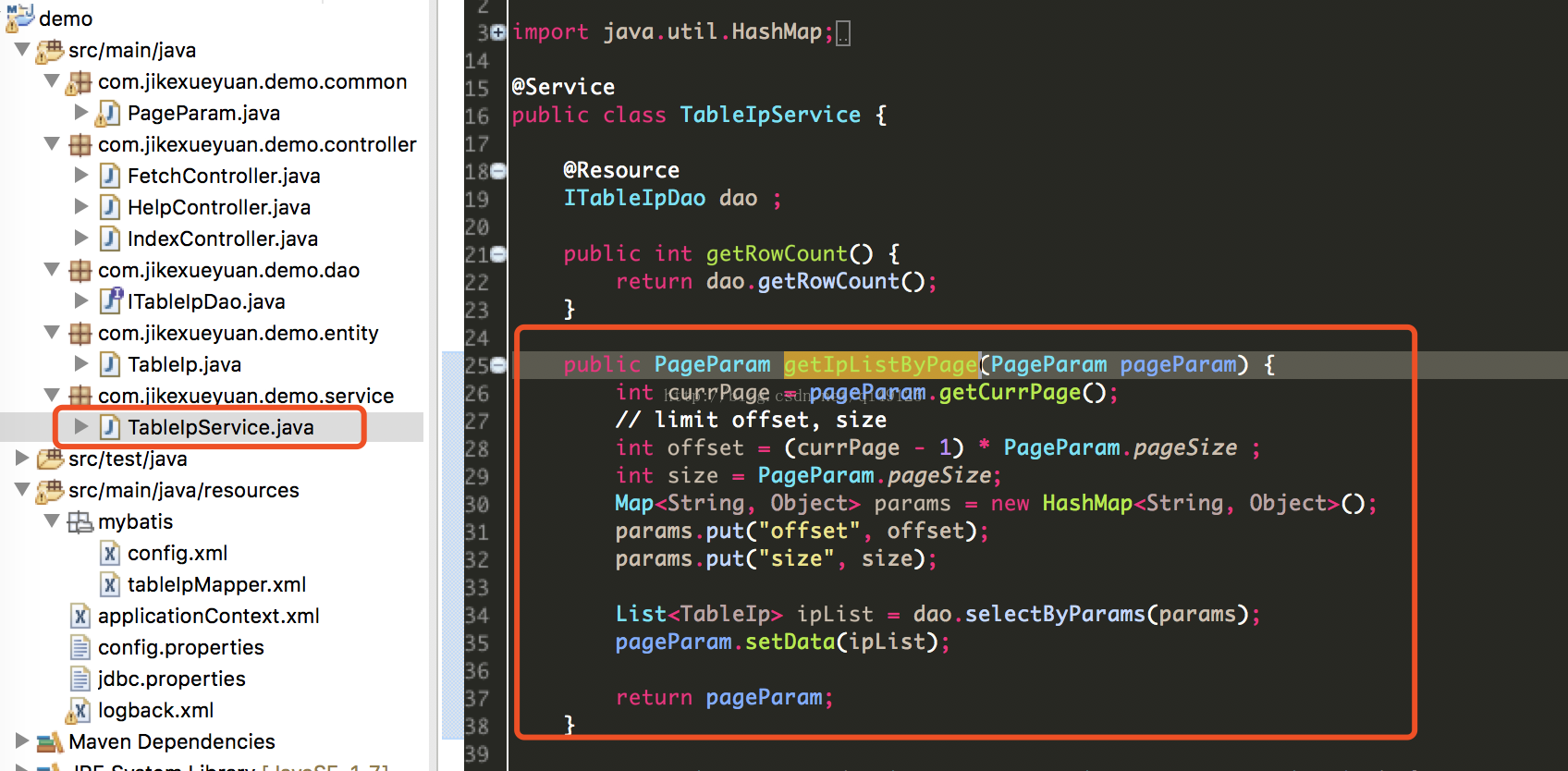 设置好页的信息之后我们根据是第几页,每一页多少条来取出这些数据,。分别调用了service层和dao层