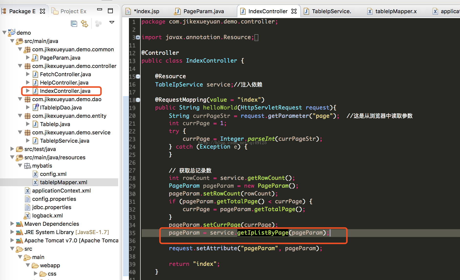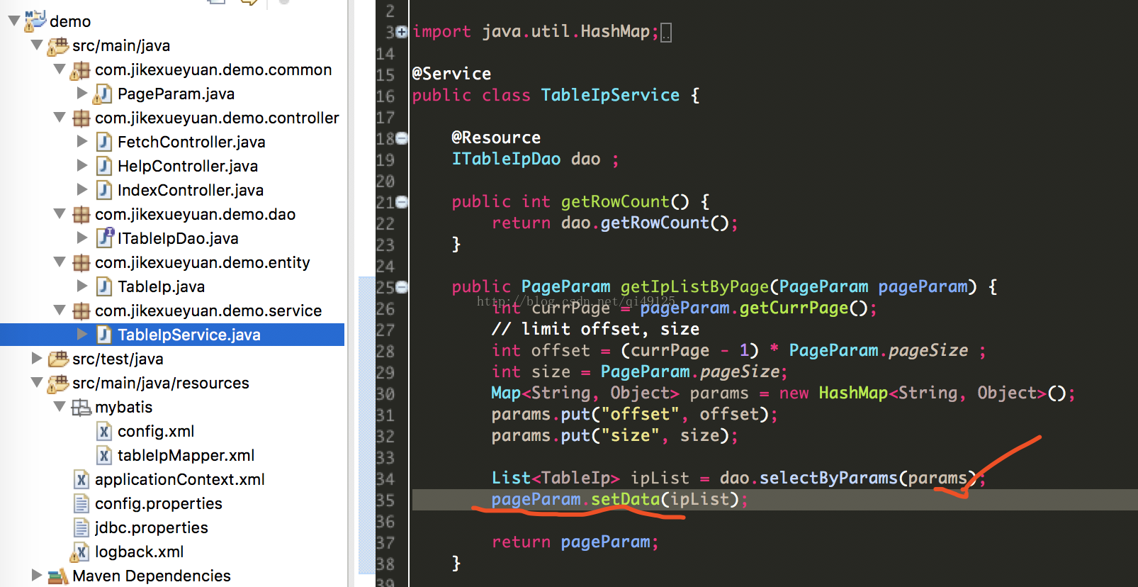 11、此时返回的是IP类的结果,然后在service中通过PageParam类的setdata将这个列表的数据传递进去并返回这个PageParam
