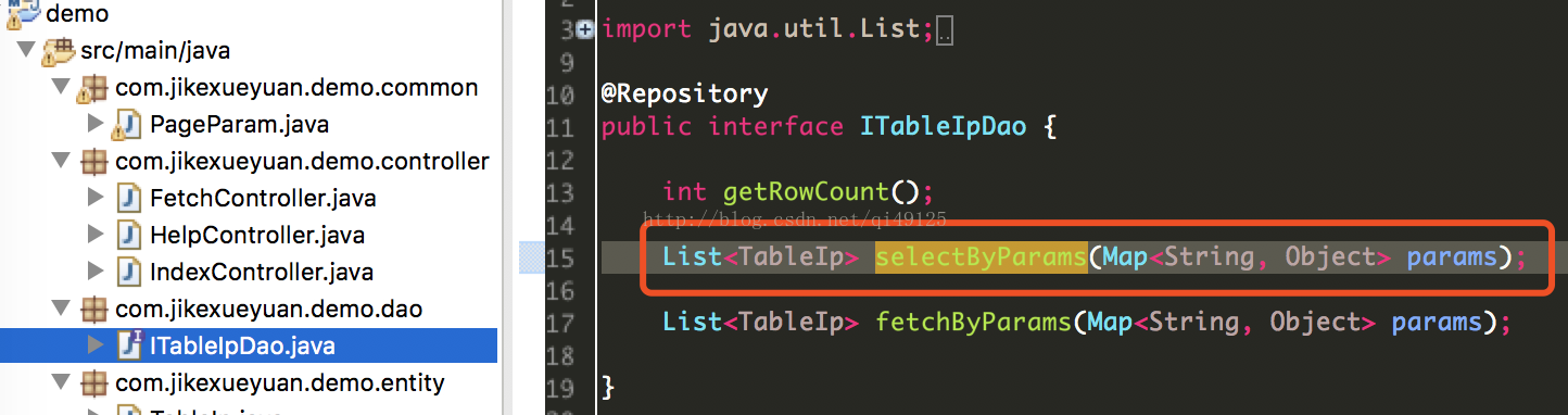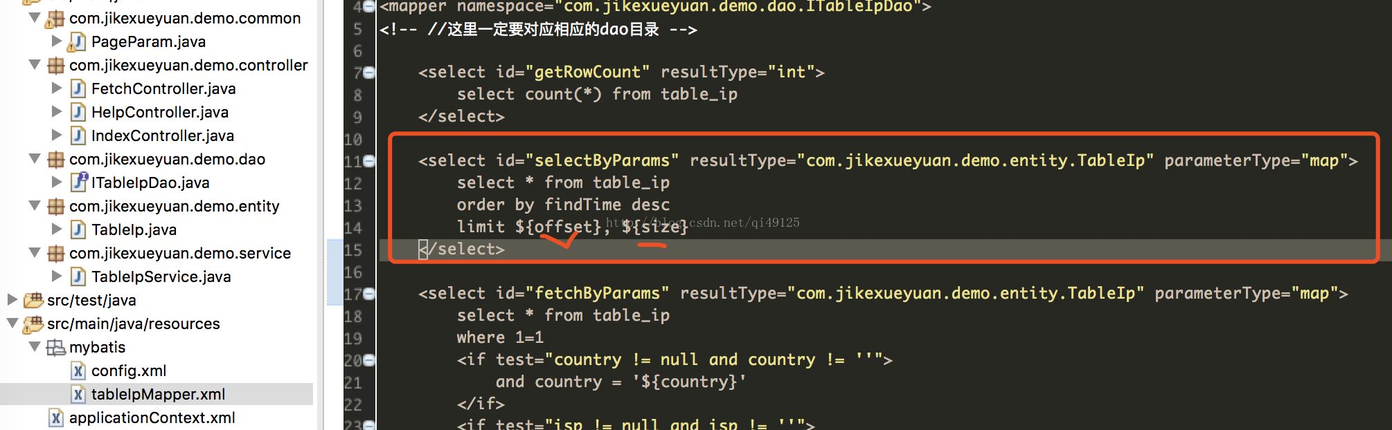 10、然后就是在mapper中实现dao中的方法。接收map中的参数