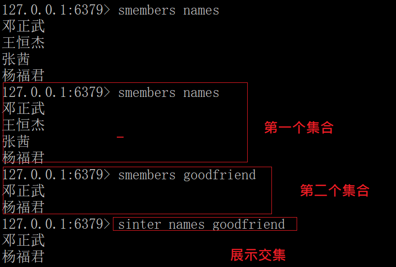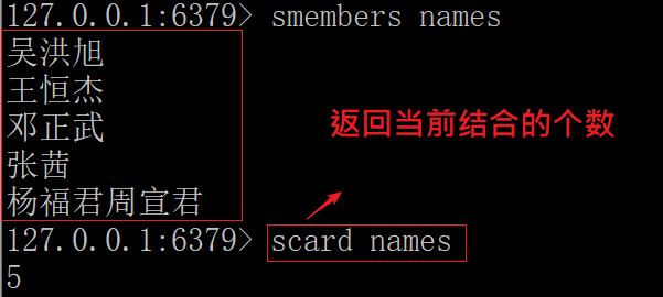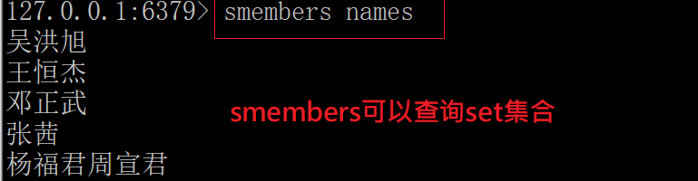 - (2)smebers:显示集合中所有元素 无序(member:成员)