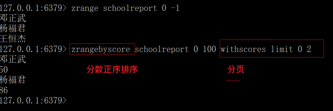 (4)zrangebyscore:按照分数查找一个范围内的元素 (实现分页)