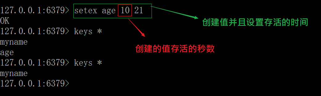| setex | 设置一个key存活的有效期(秒)(ex=expire) |