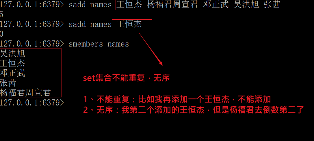 - (1)sadd:为集合添加元素(无序,自动去重)