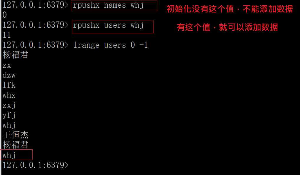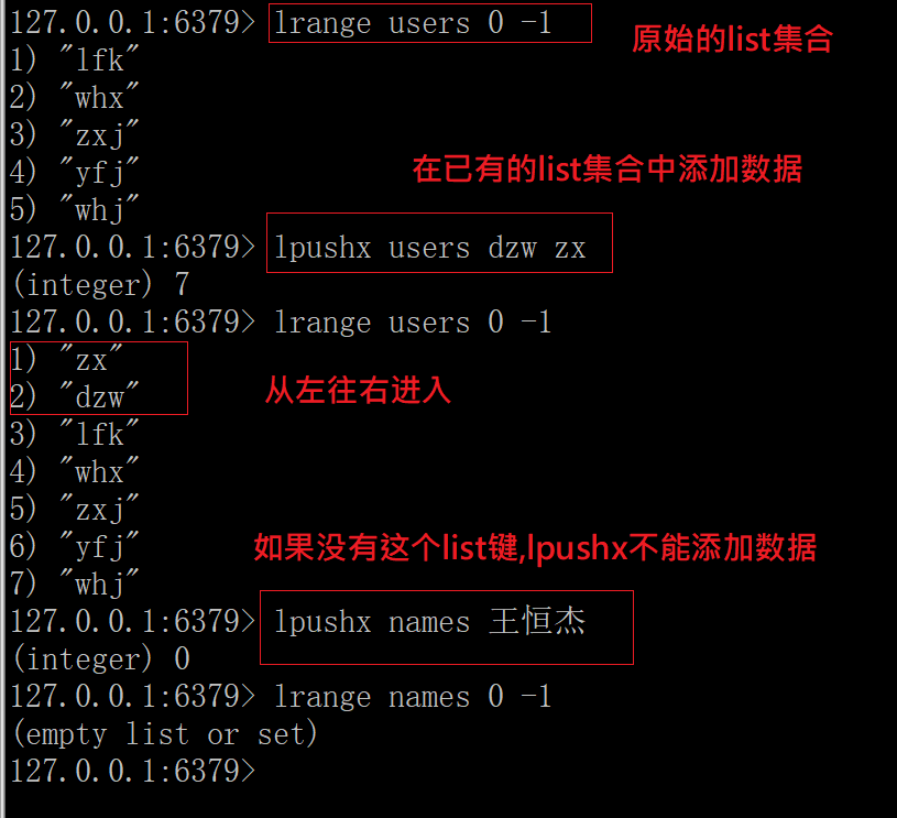 - (2)lpushx同lpush,但是必须要保证这个key存在