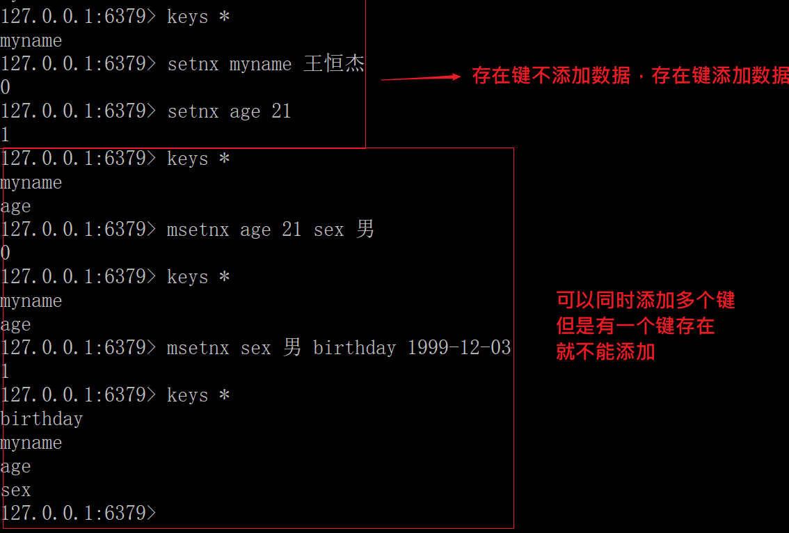 | msetnx原子操作(只要有一个存在不做任何操作) | 可以同时设置多个key,只有有一个存在都不保存 |