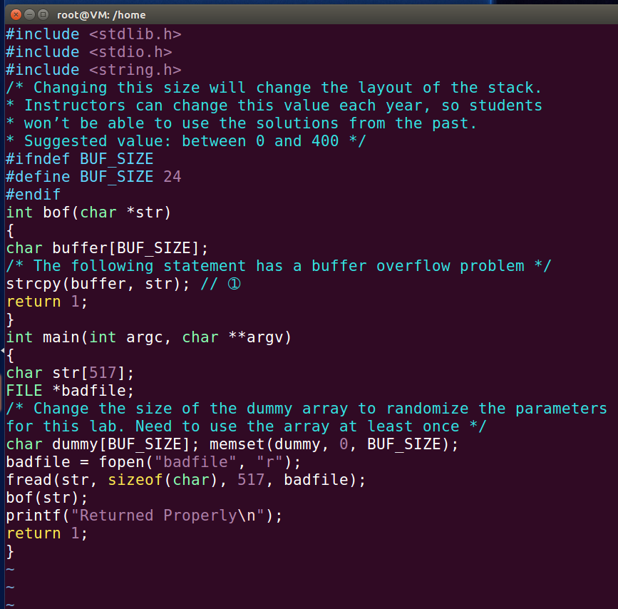 上述程序存在缓冲区溢出漏洞。它首先从一个名为badfile的文件中读取一个输入,然后将这个输入传递给bof()函数中的另一个缓冲区。原始输入的最大长度可以是517字节,但是bof()中的缓冲区只有BUFSIZE字节长,小于517.因为strcpy()不检查边界,所以会发生缓冲区溢出。由于该程序是一个根用户拥有的设置-UID程序,如果一个普通用户可以利用这个缓冲区溢出漏洞,用户可能能够获得一个根外壳。需要注意的是,程序从一个名为badfile的文件中获取输入。该文件由用户控制。现在,我们的目标是为badfile创建内容,这样当易受攻击的程序将内容复制到它的缓冲区时,可以产生一个根外壳。
